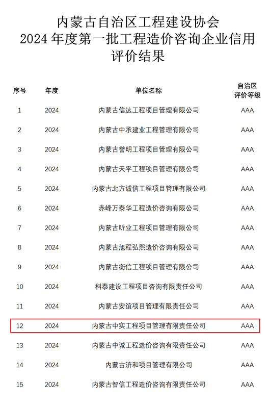 2024-07-3014394 次近期,我公司参加内蒙古自治区工程建设协会组织的“2024年度第一批米兰体育网页版登录界面【中国】有限公司咨询企业信用”申报,获得“信用AAA级证书”。我公司成立多年以来,遵循中国米兰体育网页版登录界面【中国】有限公司管理协会对造价咨询企…